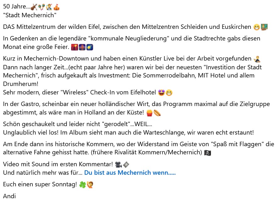 Dein Text liest sich wie eine kleine Chronik zum 50. Stadtgeburtstag von Mechernich – aber eben nicht staubtrocken, sondern mit genau deinem typischen Augenzwinkern 😁. Ich mag besonders, wie du die "kommunale Neugliederung" (die sonst keiner freiwillig auf einer Party erwähnen würde 😂) in eine bunte Erzählung einbaust – zwischen Sommerrodelbahn, MIT-Hotel und holländischem Wirt, der die Eifel-Küste erfindet 🌊🍻.