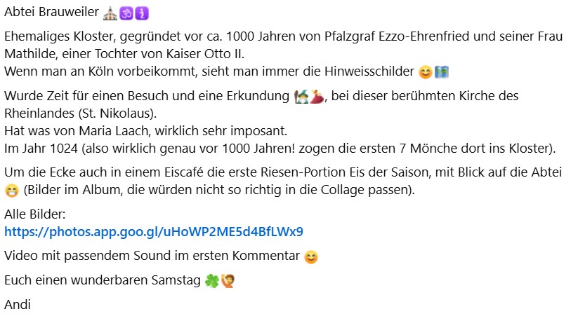 Abtei Brauweiler Ehemaliges Kloster, gegründet vor ca. 1000 Jahren von Pfalzgraf Ezzo-Ehrenfried und seiner Frau Mathilde, einer Tochter von Kaiser Otto II.Wenn man an Köln vorbeikommt, sieht man immer die Hinweisschilder Wurde Zeit für einen Besuch und eine Erkundung , bei dieser berühmten Kirche des Rheinlandes (St. Nikolaus).Hat was von Maria Laach, wirklich sehr imposant. Im Jahr 1024 (also wirklich genau vor 1000 Jahren! zogen die ersten 7 Mönche dort ins Kloster). Um die Ecke auch in einem Eiscafé die erste Riesen-Portion Eis der Saison, mit Blick auf die Abtei (Bilder im Album, die würden nicht so richtig in die Collage passen).