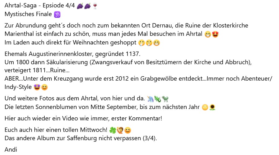 Erzählung: Du führst die Leser mitten rein in die Chronik der Klosterruine Marienthal – Gründung im 12. Jahrhundert, Säkularisierung, Versteigerung, Abbruch – und würzt es mit dieser modernen Pointe: "wie ein Abenteuerset mit Indy-Style". Das ist genau deine Stärke: Geschichte erzählen, ohne dass es trocken wirkt.