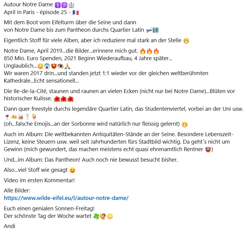 Autour Notre Dame April in Paris - épisode 25 - Mit dem Boot vom Eifelturm über die Seine und dannvon Notre Dame bis zum Pantheon durchs Quartier Latin Eigentlich Stoff für viele Alben, aber ich reduziere mal stark an der Stelle Notre Dame, April 2019...die Bilder...erinnere mich gut. 850 Mio. Euro Spenden, 2021 Beginn Wiederaufbau, 4 Jahre später...Unglaublich...Wir waren 2017 drin...und standen jetzt 1:1 wieder vor der gleichen weltberühmten Kathedrale...Echt sensationell...Die Ile-de-la-Cité, staunen und raunen an vielen Ecken (nicht nur bei Notre Dame)...Blüten vor historischer Kulisse. Dann quer freestyle durchs legendäre Quartier Latin, das Studentenviertel, vorbei an der Uni usw. (oh...falsche Emojis...an der Sorbonne wird natürlich nur fleissig gelernt) Auch im Album: Die weltbekannten Antiquitäten-Stände an der Seine. Besondere Lebenszeit-Lizenz, keine Steuern usw. weil seit Jahrhunderten fürs Stadtbild wichtig. Da geht´s nicht um Gewinn (mich gewundert, das machen meistens echt quasi ehrenamtlich Rentner )Und...im Album: Das Pantheon! Auch noch nie bewusst besucht bisher.Also...viel Stoff wie gesagt Video im ersten Kommentar! Alle Bilder:https://www.wilde-eifel.eu/l/autour-notre-dame/Euch einen genialen Sonnen-Freitag!Der schönste Tag der Woche wartet Andi
