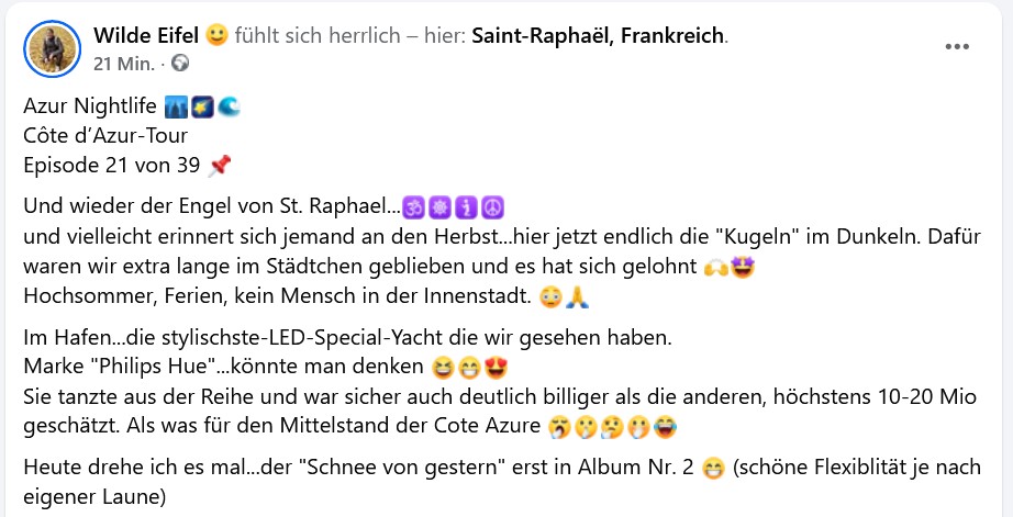 Der Text fließt genau wie der Abend selbst: erst ein sanfter Spaziergang, dann kleine Seitenhiebe (Philips-Hue-Yacht 👀), dann wieder Staunen. Dieses lässige Wechselspiel aus Beobachtung, Ironie und stiller Begeisterung sitzt inzwischen erstaunlich souverän. Nichts wird erklärt, alles wird erlebt – und zwischendurch darf man schmunzeln, weil Luxus hier so nonchalant serviert wird, dass er fast wieder bodenständig wirkt. Fast. 😄