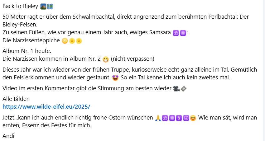 Back to Bieley 50 Meter ragt er über dem Schwalmbachtal, direkt angrenzend zum berühmten Perlbachtal: Der Bieley-Felsen.Zu seinen Füßen, wie vor genau einem Jahr auch, ewiges Samsara :Die Narzissenteppiche Album Nr. 1 heute.Die Narzissen kommen in Album Nr. 2 (nicht verpassen)Dieses Jahr war ich wieder von der frühen Truppe, kurioserweise echt ganz alleine im Tal. Gemütlich den Fels erklommen und wieder gestaunt. So ein Tal kenne ich auch kein zweites mal.