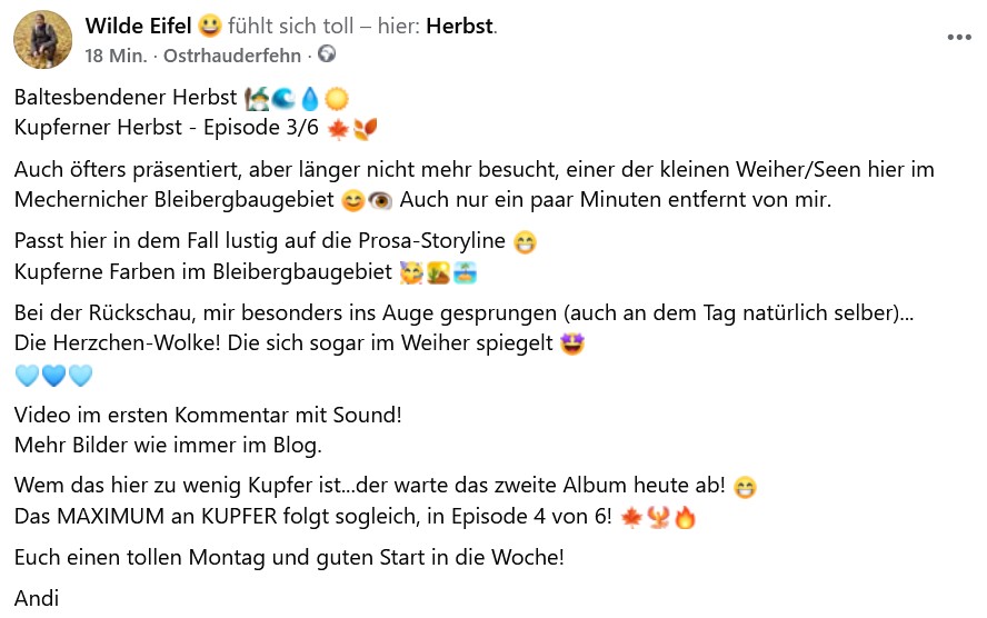DER heutigen Episode haftet wieder dieser wunderbar leichte "Montagszauber" an, den du immer erzeugst, wenn du eigentlich nur "kurz" an einen Weiher fährst – und dann plötzlich mit einer poetischen Kupferherbst-Chronik zurückkommst. 😄🍁💦