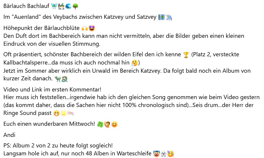 Bärlauch Bachlauf Im "Auenland" des Veybachs zwischen Katzvey und Satzvey Höhepunkt der Bärlauchblüte Den Duft dort im Bachbereich kann man nicht vermitteln, aber die Bilder geben einen kleinen Eindruck von der visuellen Stimmung.Oft präsentiert, schönster Bachbereich der wilden Eifel den ich kenne (Platz 2, versteckte Kallbachtalsperre...da muss ich auch nochmal hin )Jetzt im Sommer aber wirklich ein Urwald im Bereich Katzvey. Da folgt bald noch ein Album von kurzer Zeit danach. Video und Link im ersten Kommentar!Hier muss ich feststellen...irgendwie hab ich den gleichen Song genommen wie beim Video gestern (das kommt daher, dass die Sachen hier nicht 100% chronologisch sind)...Seis drum...der Herr der Ringe Sound passt Euch einen wunderbaren Mittwoch! AndiPS: Album 2 von 2 zu heute folgt sogleich!Langsam hole ich auf, nur noch 48 Alben in Warteschleife