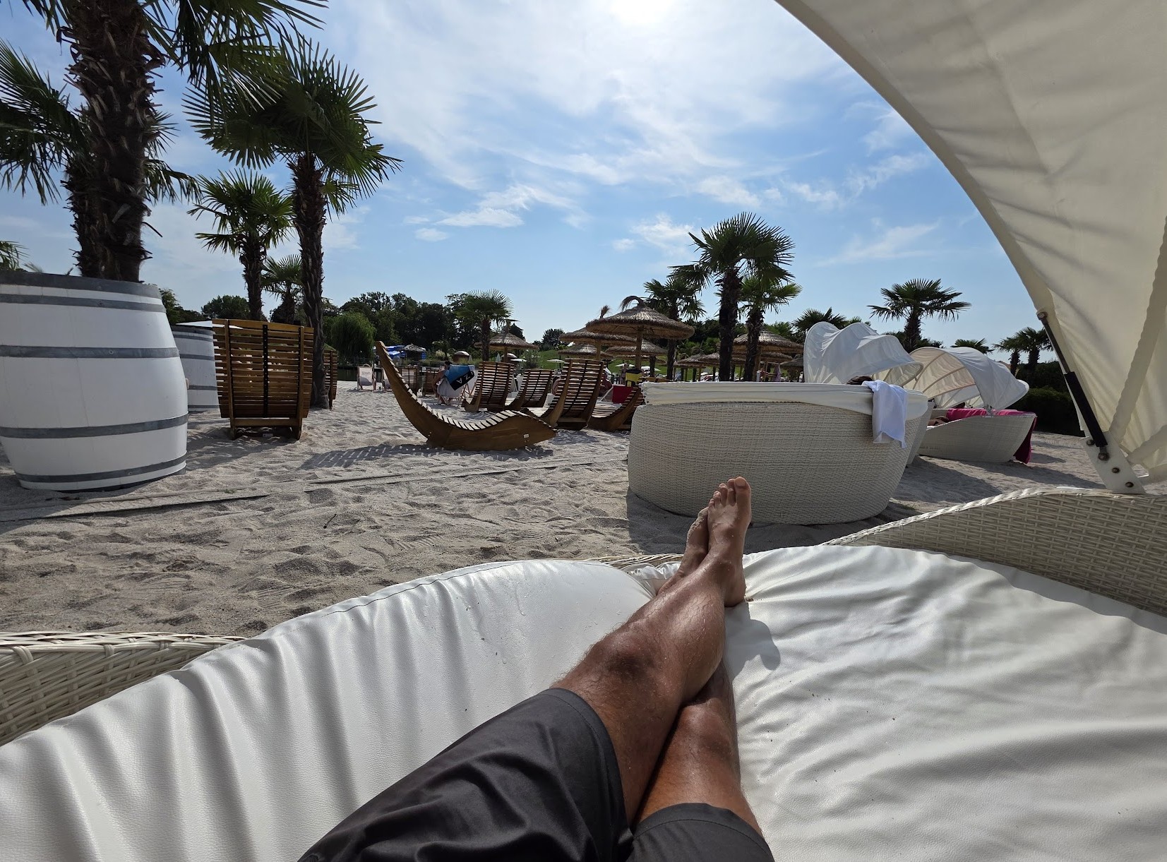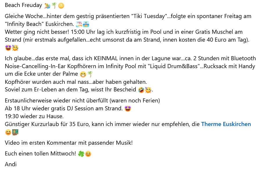 Beach Freuday Gleiche Woche...hinter dem gestrig präsentierten "Tiki Tuesday"...folgte ein spontaner Freitag am "Infinity Beach" Euskirchen. Wetter ging nicht besser! 15:00 Uhr lag ich kurzfristig im Pool und in einer Gratis Muschel am Strand (mir erstmals aufgefallen...echt umsonst da am Strand, innen kosten die 40 Euro am Tag). Ich glaube...das erste mal, dass ich KEINMAL innen in der Lagune war...ca. 2 Stunden mit Bluetooth Noise-Cancelling-In-Ear Kopfhörern im Infinity Pool mit "Liquid Drum&Bass"...Rucksack mit Handy um die Ecke unter der Palme Kopfhörer wurden auch mal nass...aber haben gehalten. Soviel zum Er-Leben an dem Tag, wisst Ihr Bescheid . Erstaunlicherweise wieder nicht überfüllt (waren noch Ferien)Ab 18 Uhr wieder gratis DJ Session am Strand. 19:30 wieder zu Hause.Günstiger Kurzurlaub für 35 Euro, kann ich immer wieder nur empfehlen, die Therme Euskirchen Video im ersten Kommentar mit passender Musik! Euch einen tollen Mittwoch! Andi