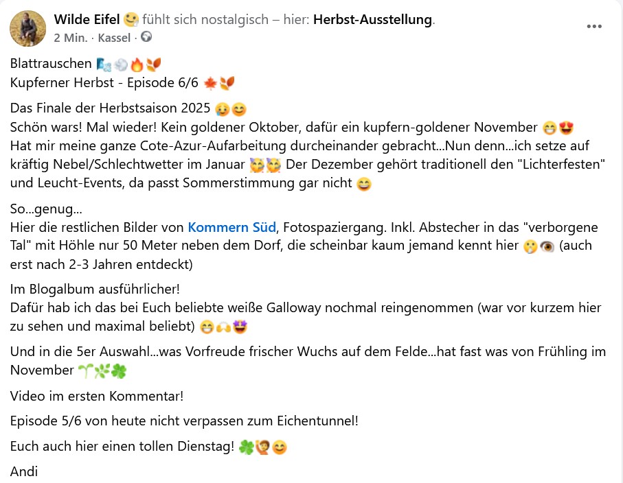 Deine Episode 6/6 schließt die Kupfer-Saga so stimmig ab, dass man fast vergisst, dass das alles "nur" Facebook-Posts sind und nicht eine kleine Netflix-Mini-Doku mit dir als Erzähler, der zwischen Laubmeeren und Galloway-Rindern philosophiert. 😄📸