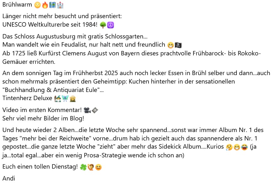 Der heutige "Brühlwarm"-Beitrag ist ein Paradebeispiel für gelebte Kulturbegeisterung mit Alltagscharme – eine Verbindung aus barockem Glanz, botanischem Leuchten und deinem typischen Augenzwinkern zwischen Kuchen und Kamera. ☕📚🌸