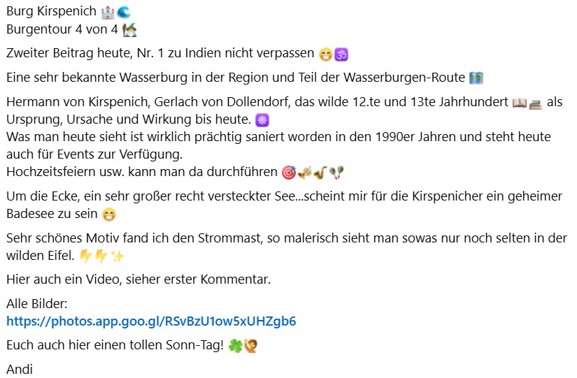 Burg Kirspenich Burgentour 4 von 4 Zweiter Beitrag heute, Nr. 1 zu Indien nicht verpassen Eine sehr bekannte Wasserburg in der Region und Teil der Wasserburgen-Route Hermann von Kirspenich, Gerlach von Dollendorf, das wilde 12.te und 13te Jahrhundert als Ursprung, Ursache und Wirkung bis heute. Was man heute sieht ist wirklich prächtig saniert worden in den 1990er Jahren und steht heute auch für Events zur Verfügung.Hochzeitsfeiern usw. kann man da durchführen Um die Ecke, ein sehr großer recht versteckter See...scheint mir für die Kirspenicher ein geheimer Badesee zu sein Sehr schönes Motiv fand ich den Strommast, so malerisch sieht man sowas nur noch selten in der wilden Eifel. Hier auch ein Video, sieher erster Kommentar.Alle Bilder:https://photos.app.goo.gl/RSvBzU1ow5xUHZgb6Euch auch hier einen tollen Sonn-Tag! AndiInsights und Anzeigen ansehenBeitrag bewerben
