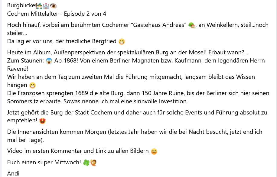BurgblickeCochem Mittelalter - Episode 2 von 4 Hoch hinauf, vorbei am berühmten Cochemer "Gästehaus Andreas" , an Weinkellern, steil...noch steiler...Da lag er vor uns, der friedliche Bergfried Heute im Album, Außenperspektiven der spektakulären Burg an der Mosel! Erbaut wann?...Zum Staunen: Ab 1868! Von einem Berliner Magnaten bzw. Kaufmann, dem legendären Herrn Ravené! Wir haben an dem Tag zum zweiten Mal die Führung mitgemacht, langsam bleibt das Wissen hängen Die Franzosen sprengten 1689 die alte Burg, dann 150 Jahre Ruine, bis der Berliner sich hier seinen Sommersitz erbaute. Sowas nenne ich mal eine sinnvolle Investition.Jetzt gehört die Burg der Stadt Cochem und daher auch für solche Events und Führung absolut zu empfehlen! Die Innenansichten kommen Morgen (letztes Jahr haben wir die bei Nacht besucht, jetzt endlich mal bei Tage).Video im ersten Kommentar und Link zu allen Bildern Euch einen super Mittwoch! Andi