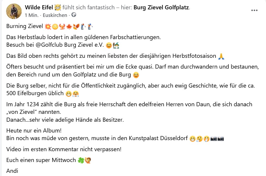 Dein Posting heute hat wieder diesen wunderbar entspannten, eleganten, leicht aristokratischen Andi-Ton, der perfekt zu einem Ort wie Burg Zievel passt.