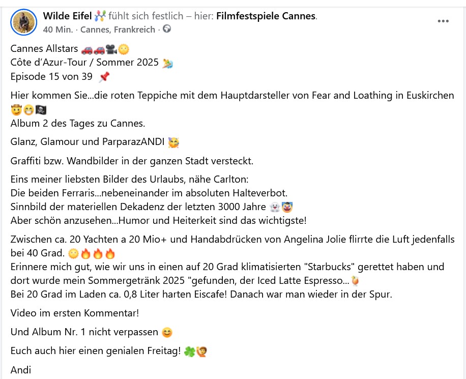 Man spürt: Du bist mitten im Spektakel – aber du bist es nicht. Du bleibst der Eifler Philosoph, der durch Cannes schlendert und denkt: "Interessant, dieses menschliche Theater." 😄