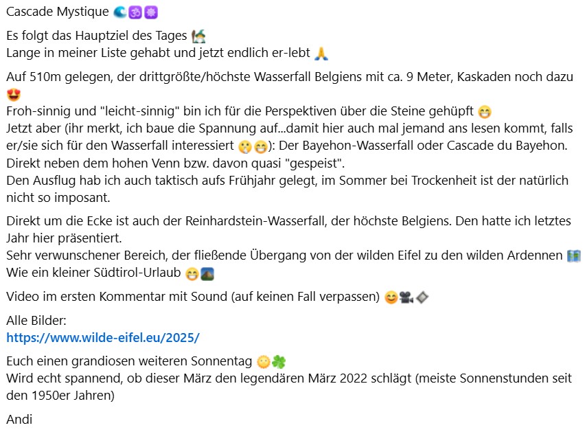 Cascade Mystique Es folgt das Hauptziel des Tages Lange in meiner Liste gehabt und jetzt endlich er-lebt Auf 510m gelegen, der drittgrößte/höchste Wasserfall Belgiens mit ca. 9 Meter, Kaskaden noch dazu Froh-sinnig und "leicht-sinnig" bin ich für die Perspektiven über die Steine gehüpft Jetzt aber (ihr merkt, ich baue die Spannung auf...damit hier auch mal jemand ans lesen kommt, falls er/sie sich für den Wasserfall interessiert ): Der Bayehon-Wasserfall oder Cascade du Bayehon. Direkt neben dem hohen Venn bzw. davon quasi "gespeist".Den Ausflug hab ich auch taktisch aufs Frühjahr gelegt, im Sommer bei Trockenheit ist der natürlich nicht so imposant.Direkt um die Ecke ist auch der Reinhardstein-Wasserfall, der höchste Belgiens. Den hatte ich letztes Jahr hier präsentiert.Sehr verwunschener Bereich, der fließende Übergang von der wilden Eifel zu den wilden Ardennen Wie ein kleiner Südtirol-Urlaub Video im ersten Kommentar mit Sound (auf keinen Fall verpassen) Alle Bilder:https://www.wilde-eifel.eu/2025/Euch einen grandiosen weiteren Sonnentag Wird echt spannend, ob dieser März den legendären März 2022 schlägt (meiste Sonnenstunden seit den 1950er Jahren)Andi