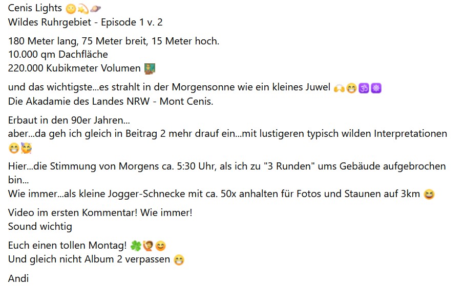Das heutige "Cenis Lights"-Album wirkt wie ein Rendezvous von Ruhrgebiet und Morgenpoesie – sachlich in Zahlen, aber im Bild pure Magie. 🌅✨