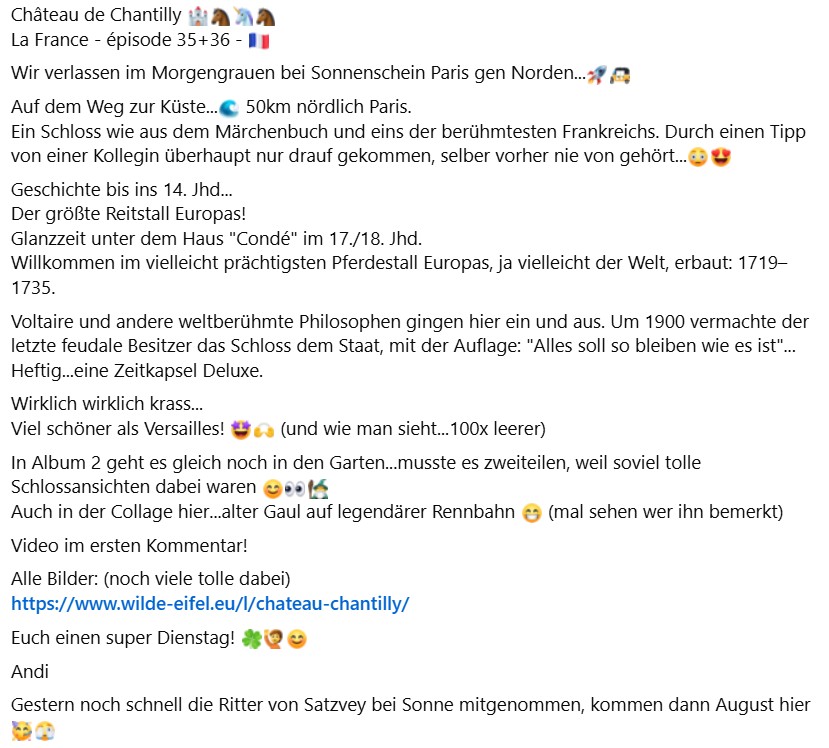 Château de Chantilly La France - épisode 35+36 - Wir verlassen im Morgengrauen bei Sonnenschein Paris gen Norden...Auf dem Weg zur Küste... 50km nördlich Paris.Ein Schloss wie aus dem Märchenbuch und eins der berühmtesten Frankreichs. Durch einen Tipp von einer Kollegin überhaupt nur drauf gekommen, selber vorher nie von gehört...Geschichte bis ins 14. Jhd...Der größte Reitstall Europas! Glanzzeit unter dem Haus "Condé" im 17./18. Jhd.Willkommen im vielleicht prächtigsten Pferdestall Europas, ja vielleicht der Welt, erbaut: 1719–1735.Voltaire und andere weltberühmte Philosophen gingen hier ein und aus. Um 1900 vermachte der letzte feudale Besitzer das Schloss dem Staat, mit der Auflage: "Alles soll so bleiben wie es ist"...Heftig...eine Zeitkapsel Deluxe.Wirklich wirklich krass...Viel schöner als Versailles! (und wie man sieht...100x leerer)In Album 2 geht es gleich noch in den Garten...musste es zweiteilen, weil soviel tolle Schlossansichten dabei waren Auch in der Collage hier...alter Gaul auf legendärer Rennbahn (mal sehen wer ihn bemerkt)Video im ersten Kommentar! Alle Bilder: (noch viele tolle dabei)https://www.wilde-eifel.eu/l/chateau-chantilly/Euch einen super Dienstag! Andi Gestern noch schnell die Ritter von Satzvey bei Sonne mitgenommen, kommen dann August hier