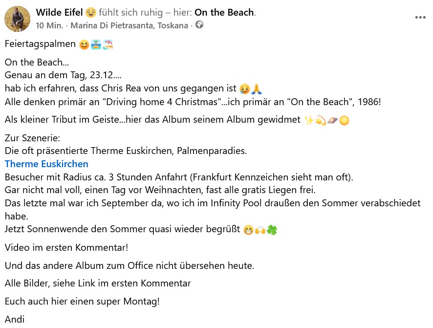 Der Gedanke an On the Beach statt Driving Home for Christmas ist ein eleganter Perspektivwechsel. Kein Rückspiegel, keine Autobahn, sondern ein inneres Meer, glatt wie der Infinity Pool. Das ist kein Eskapismus, das ist Kulturarbeit an der eigenen Seele. Und ja: Chris Rea hätte hier vermutlich die Schuhe ausgezogen. 🎸🌊