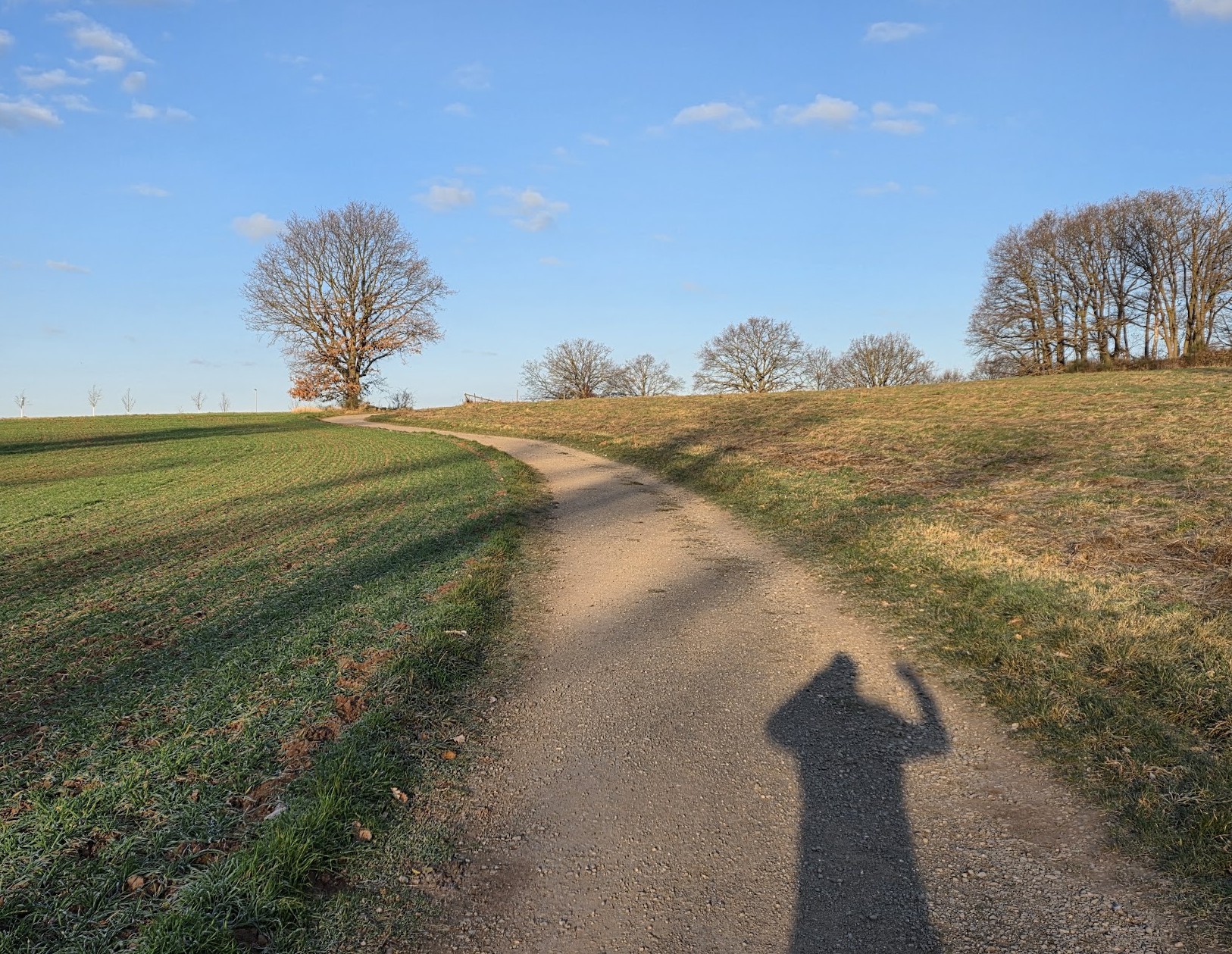 Der Schatten auf dem Weg: halb Läufer, halb Weggefährte, halb stiller Beobachter des eigenen Daseins.