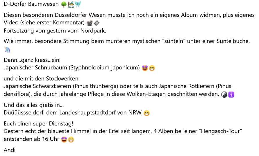 D-Dorfer Baumwesen Diesen besonderen Düsseldorfer Wesen musste ich noch ein eigenes Album widmen, plus eigenes Video (siehe erster Kommentar) Fortsetzung von gestern vom Nordpark.Wie immer, besondere Stimmung beim munteren mystischen "sünteln" unter einer Süntelbuche. Dann...ganz krass...ein:Japanischer Schnurbaum (Styphnolobium japonicum) und die mit den Stockwerken:Japanische Schwarzkiefern (Pinus thunbergii) oder teils auch Japanische Rotkiefern (Pinus densiflora), die durch jahrelange Pflege in diese Wolken-Etagen geschnitten werden. Und das alles gratis in...Düüüüssseldorf, dem Landeshauptstadtdorf von NRW Euch einen super Dienstag!Gestern echt der blaueste Himmel in der Eifel seit langem, 4 Alben bei einer "Hengasch-Tour" entstanden ab 16 Uhr Andi