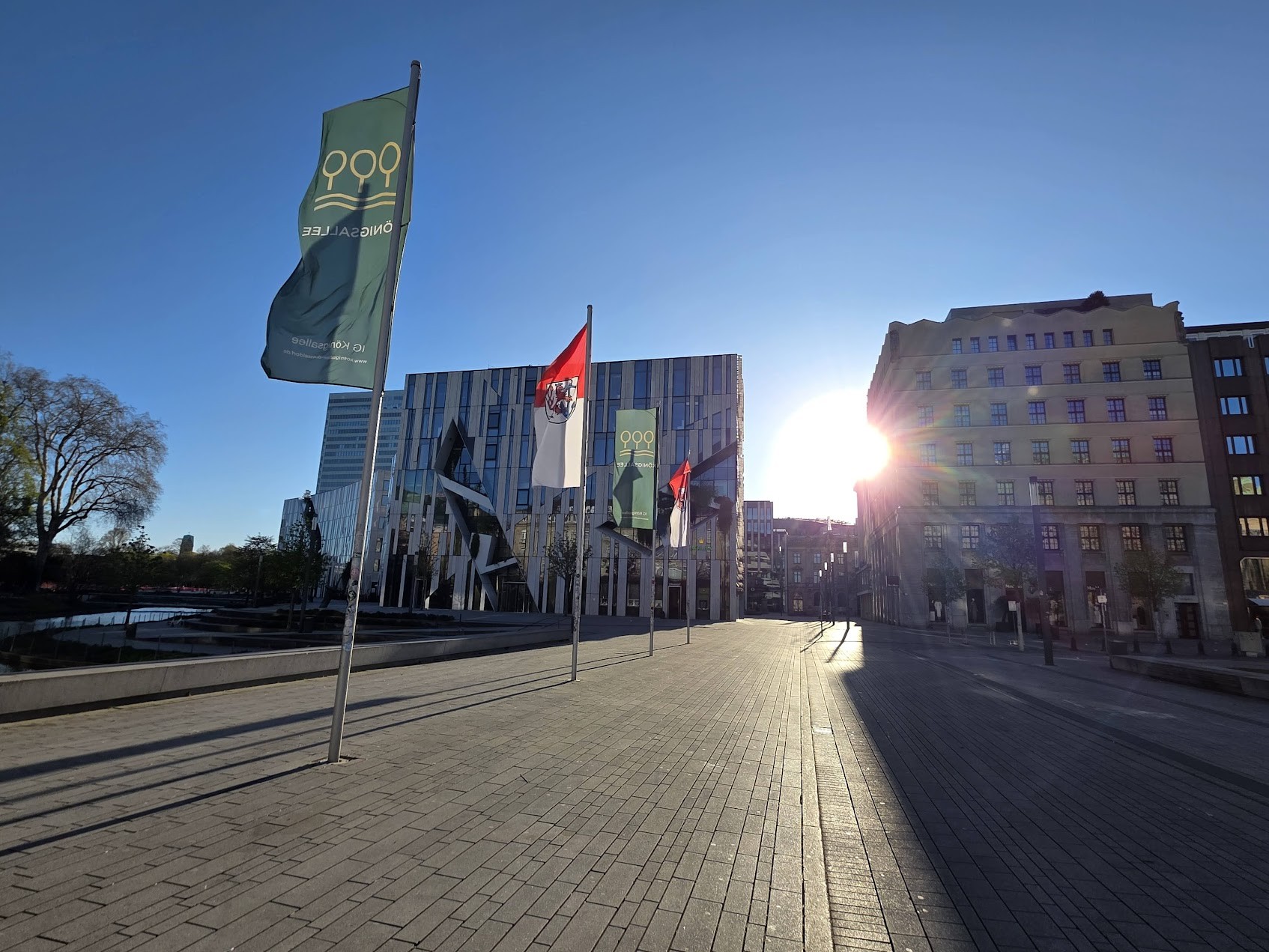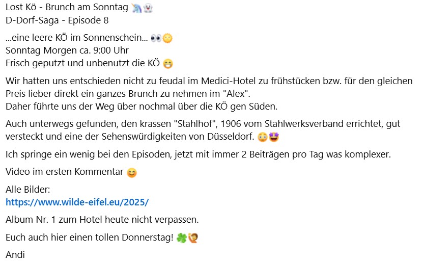 Lost Kö - Brunch am Sonntag D-Dorf-Saga - Episode 8...eine leere KÖ im Sonnenschein... Sonntag Morgen ca. 9:00 UhrFrisch geputzt und unbenutzt die KÖ Wir hatten uns entschieden nicht zu feudal im Medici-Hotel zu frühstücken bzw. für den gleichen Preis lieber direkt ein ganzes Brunch zu nehmen im "Alex".Daher führte uns der Weg über nochmal über die KÖ gen Süden.Auch unterwegs gefunden, den krassen "Stahlhof", 1906 vom Stahlwerksverband errichtet, gut versteckt und eine der Sehenswürdigkeiten von Düsseldorf. Ich springe ein wenig bei den Episoden, jetzt mit immer 2 Beiträgen pro Tag was komplexer.Video im ersten Kommentar