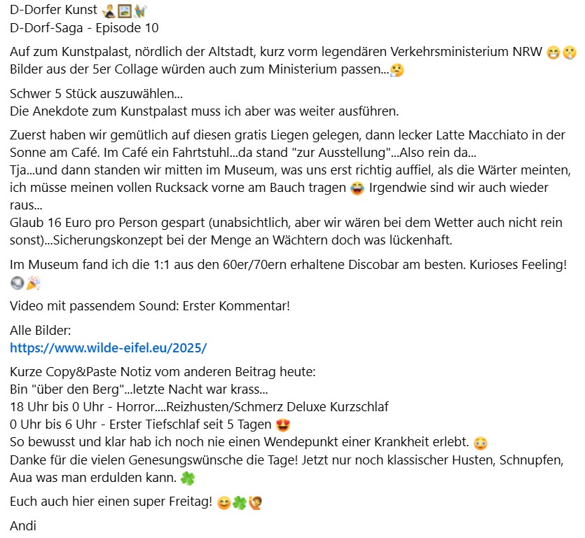 D-Dorfer Kunst D-Dorf-Saga - Episode 10Auf zum Kunstpalast, nördlich der Altstadt, kurz vorm legendären Verkehrsministerium NRW Bilder aus der 5er Collage würden auch zum Ministerium passen...Schwer 5 Stück auszuwählen...Die Anekdote zum Kunstpalast muss ich aber was weiter ausführen.Zuerst haben wir gemütlich auf diesen gratis Liegen gelegen, dann lecker Latte Macchiato in der Sonne am Café. Im Café ein Fahrtstuhl...da stand "zur Ausstellung"...Also rein da...Tja...und dann standen wir mitten im Museum, was uns erst richtig auffiel, als die Wärter meinten, ich müsse meinen vollen Rucksack vorne am Bauch tragen Irgendwie sind wir auch wieder raus...Glaub 16 Euro pro Person gespart (unabsichtlich, aber wir wären bei dem Wetter auch nicht rein sonst)...Sicherungskonzept bei der Menge an Wächtern doch was lückenhaft.Im Museum fand ich die 1:1 aus den 60er/70ern erhaltene Discobar am besten. Kurioses Feeling! Video mit passendem Sound: Erster Kommentar!