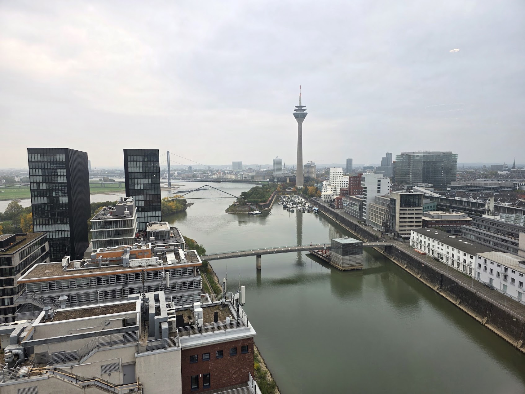 Du setzt das wie ein ironisches Spiegelbild des modernen Materialismus in Szene – du bist mitten im "rheinischen Manhattan", aber dein Fokus liegt auf Streusel, Cappuccino und Menschlichkeit. 🤎