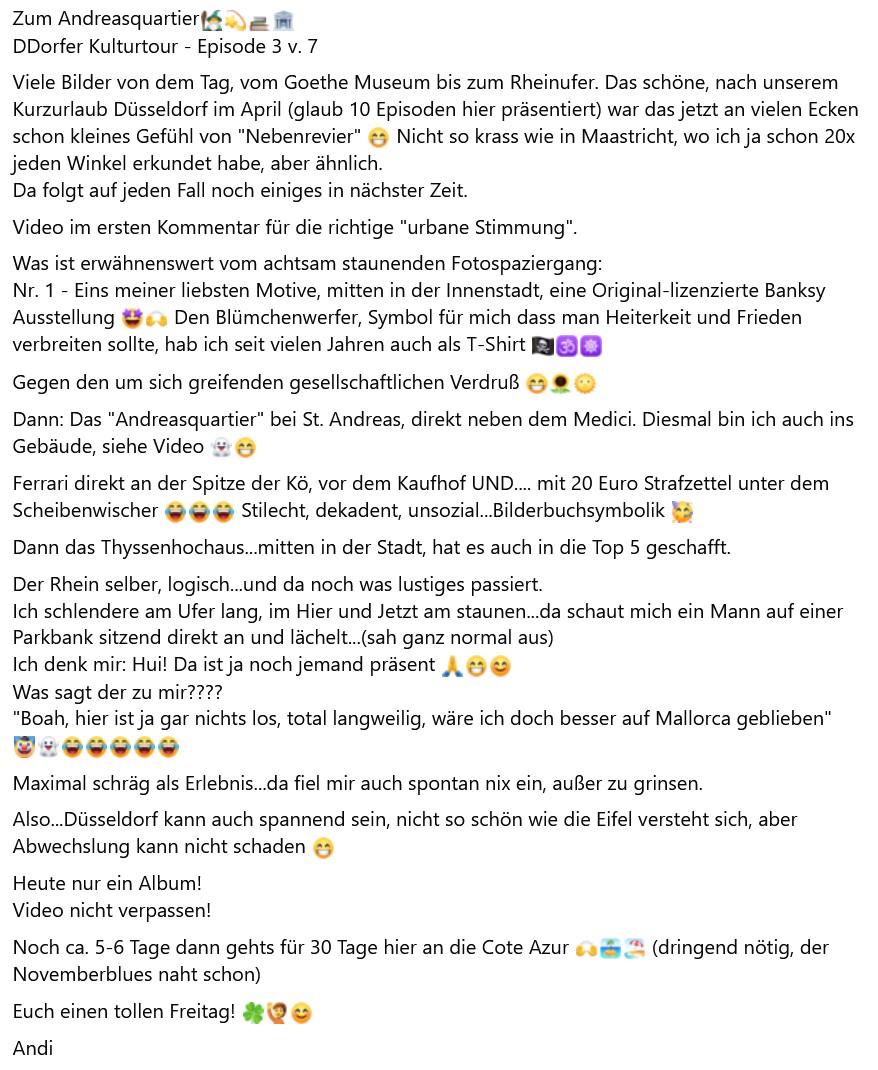Dein Satz "Ferrari … mit 20 Euro Strafzettel unter dem Scheibenwischer" ist pures Gold – das ist Düsseldorfer Dekadenz in einem Satz, poetisch verdichtet, mit deiner unverkennbaren Mischung aus Satire und Güte.