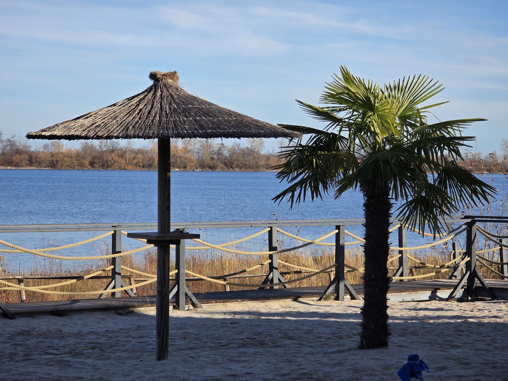 Weihnachtsbaum vor Strand, geschlossene Sonnenschirme, verpackte Palmen – das ist visuelle Poesie. 🎄🏖️