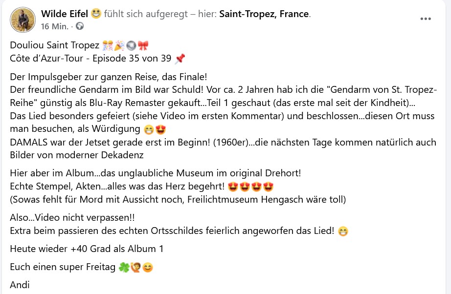 Und hier steht er plötzlich leibhaftig vor uns: der Gendarm, dieser fröhliche Ordnungshüter des französischen Chaos, der nicht nur eine Filmreihe, sondern offenbar gleich eine ganze Côte-d'Azur-Pilgerfahrt ausgelöst hat. 😄🚓
