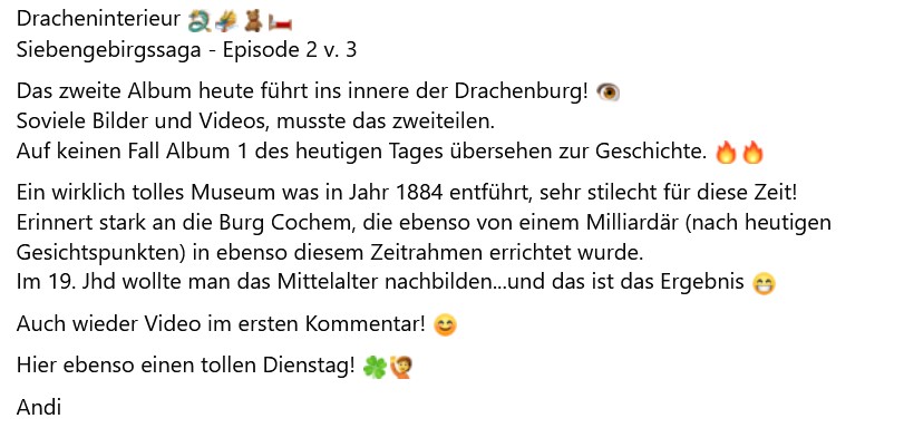 Ein Beitrag, der die Innenräume von Drachenburg wie eine Zeitmaschine erlebbar macht: pompös, leicht absurd und voller kleiner Details, die zum Schmunzeln anregen. Man liest ihn und denkt: So wohnte also der 19. Jahrhundert-Influencer – mit Zylinder, Schafsgemälde und viel Glasglanz. ✨