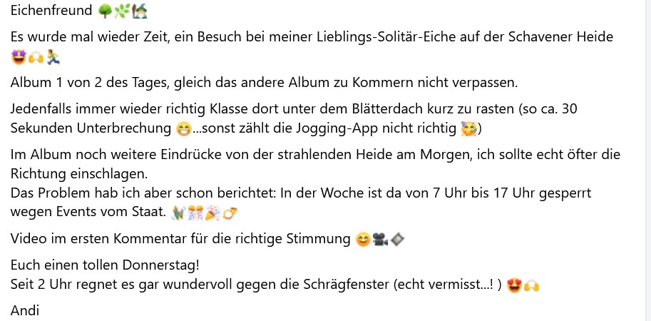 Ein Beitrag, der zeigt, dass eine Eiche nicht nur Baum, sondern Begleiter sein kann. Man liest ihn und denkt: Ja, manchmal sind 30 Sekunden unter einem Blätterdach mehr wert als tausend Schritte in der App. 🌿💫