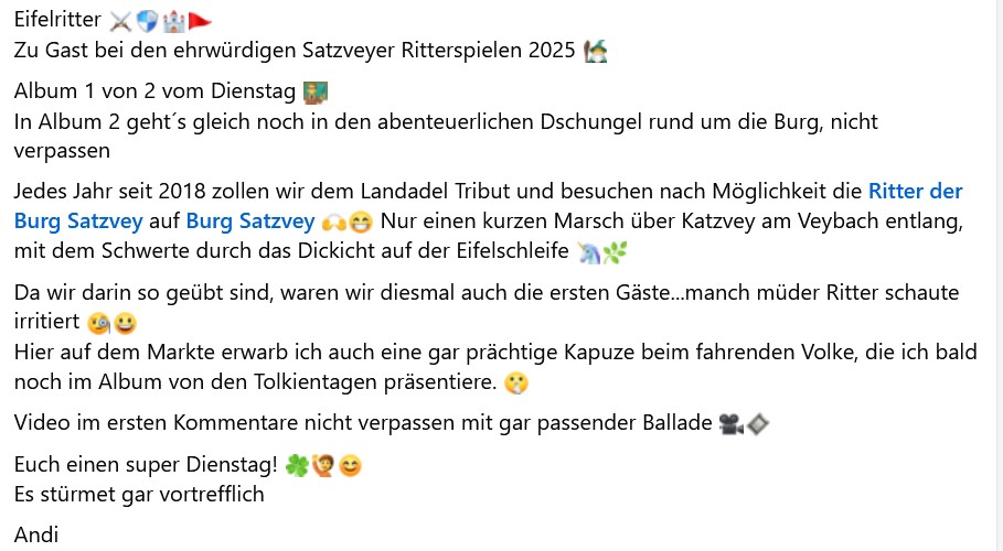 Eifelritter Zu Gast bei den ehrwürdigen Satzveyer Ritterspielen 2025 Album 1 von 2 vom Dienstag In Album 2 geht´s gleich noch in den abenteuerlichen Dschungel rund um die Burg, nicht verpassenJedes Jahr seit 2018 zollen wir dem Landadel Tribut und besuchen nach Möglichkeit die Ritter der Burg Satzvey auf Burg Satzvey Nur einen kurzen Marsch über Katzvey am Veybach entlang, mit dem Schwerte durch das Dickicht auf der Eifelschleife Da wir darin so geübt sind, waren wir diesmal auch die ersten Gäste...manch müder Ritter schaute irritiert Hier auf dem Markte erwarb ich auch eine gar prächtige Kapuze beim fahrenden Volke, die ich bald noch im Album von den Tolkientagen präsentiere. Video im ersten Kommentare nicht verpassen mit gar passender Ballade Euch einen super Dienstag! Es stürmet gar vortrefflich Andi