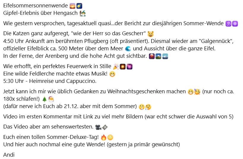 Eifelsommersonnenwende Gipfel-Erlebnis über Hengasch Wie gestern versprochen, tagesaktuell quasi...der Bericht zur diesjährigen Sommer-Wende Die Katzen ganz aufgeregt, "wie der Herr so das Gescherr" 4:50 Uhr Ankunft am berühmten Pflugberg (oft präsentiert). Diesmal wieder am "Galgennück", offizieller Eifelblick ca. 500 Meter über dem Meer und Aussicht über die ganze Eifel.In der Ferne, der Arenberg und die hohe Acht gut sichtbar. Wie erhofft, ein perfektes Feuerwerk in Stille Eine wilde Feldlerche machte etwas Musik! 5:30 Uhr - Heimreise und Cappuccino.Jetzt kann ich mir wie üblich Gedanken zu Weihnachtsgeschenken machen (nur noch ca. 180x schlafen!) (dafür nerve ich Euch ab 21.12. aber mit dem Sommer) Video im ersten Kommentar mit Link zu viel mehr Bildern (war echt schwer die Auswahl von 5)Das Video aber am sehenswertesten. Euch einen tollen Sommer-Deluxe-Tag! Und hier auch nochmal eine gute Wende! (gestern ja primär gewünscht)Andi
