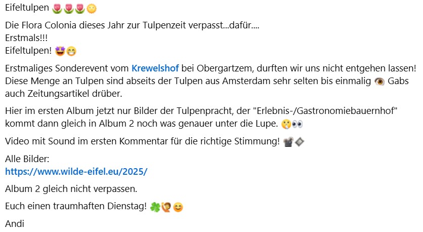 Eifeltulpen Die Flora Colonia dieses Jahr zur Tulpenzeit verpasst...dafür....Erstmals!!!Eifeltulpen! Erstmaliges Sonderevent vom Krewelshof bei Obergartzem, durften wir uns nicht entgehen lassen! Diese Menge an Tulpen sind abseits der Tulpen aus Amsterdam sehr selten bis einmalig Gabs auch Zeitungsartikel drüber.Hier im ersten Album jetzt nur Bilder der Tulpenpracht, der "Erlebnis-/Gastronomiebauernhof" kommt dann gleich in Album 2 noch was genauer unter die Lupe. Video mit Sound im ersten Kommentar für die richtige Stimmung!