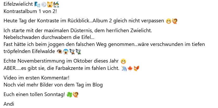 Dein Humor bleibt subtil unter der Oberfläche – dieses ironische "Echte Novemberstimmung im Oktober dieses Jahr 😁" bringt einen zum Schmunzeln, ohne die Atmosphäre zu brechen.