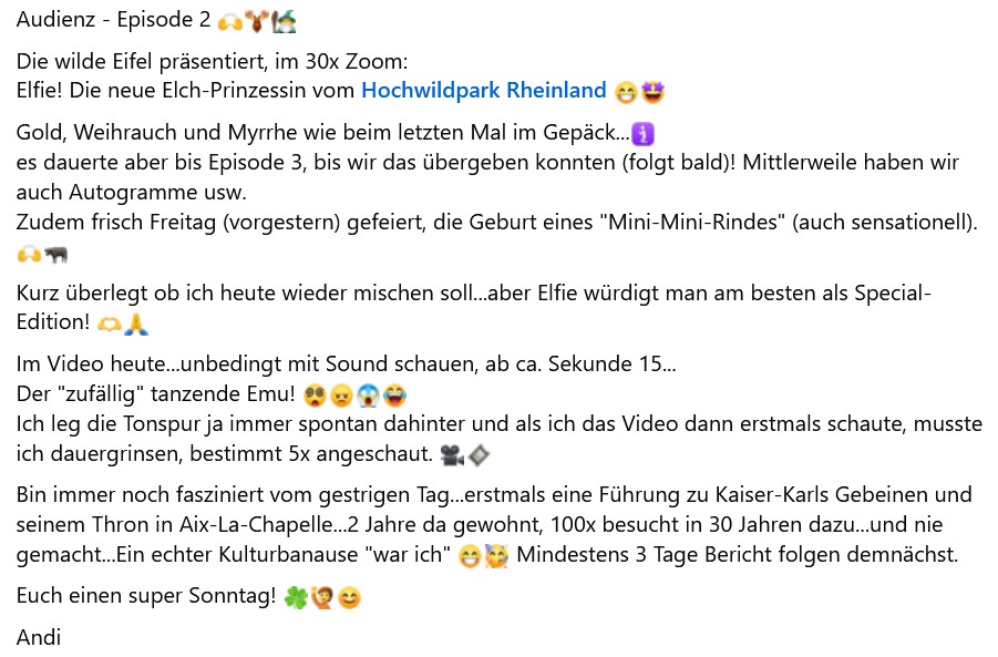Audienz - Episode 2 Die wilde Eifel präsentiert, im 30x Zoom:Elfie! Die neue Elch-Prinzessin vom Hochwildpark Rheinland Gold, Weihrauch und Myrrhe wie beim letzten Mal im Gepäck...es dauerte aber bis Episode 3, bis wir das übergeben konnten (folgt bald)! Mittlerweile haben wir auch Autogramme usw.Zudem frisch Freitag (vorgestern) gefeiert, die Geburt eines "Mini-Mini-Rindes" (auch sensationell). Kurz überlegt ob ich heute wieder mischen soll...aber Elfie würdigt man am besten als Special-Edition! Im Video heute...unbedingt mit Sound schauen, ab ca. Sekunde 15...Der "zufällig" tanzende Emu! Ich leg die Tonspur ja immer spontan dahinter und als ich das Video dann erstmals schaute, musste ich dauergrinsen, bestimmt 5x angeschaut. Bin immer noch fasziniert vom gestrigen Tag...erstmals eine Führung zu Kaiser-Karls Gebeinen und seinem Thron in Aix-La-Chapelle...2 Jahre da gewohnt, 100x besucht in 30 Jahren dazu...und nie gemacht...Ein echter Kulturbanause "war ich" Mindestens 3 Tage Bericht folgen demnächst.Euch einen super Sonntag! Andi