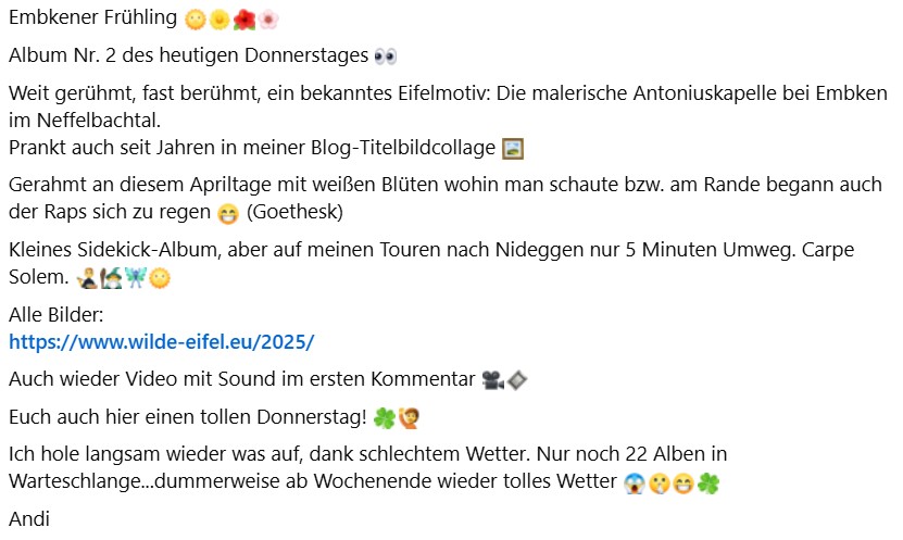Embkener Frühling Album Nr. 2 des heutigen Donnerstages Weit gerühmt, fast berühmt, ein bekanntes Eifelmotiv: Die malerische Antoniuskapelle bei Embken im Neffelbachtal.Prankt auch seit Jahren in meiner Blog-Titelbildcollage Gerahmt an diesem Apriltage mit weißen Blüten wohin man schaute bzw. am Rande begann auch der Raps sich zu regen (Goethesk)Kleines Sidekick-Album, aber auf meinen Touren nach Nideggen nur 5 Minuten Umweg. Carpe Solem.