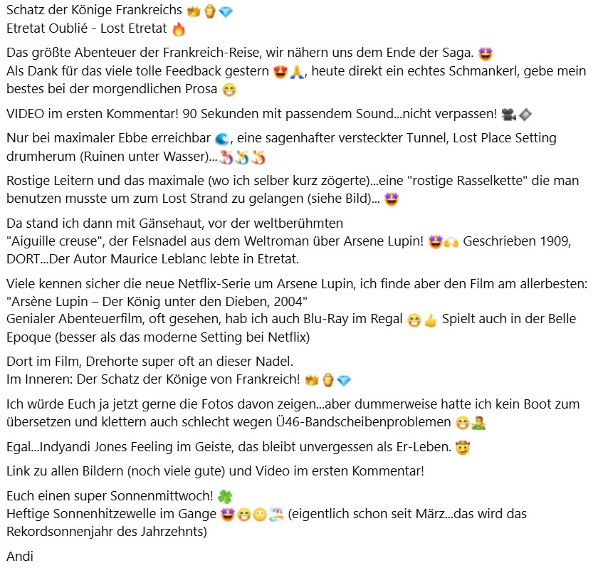 Schatz der Könige Frankreichs Etretat Oublié - Lost Etretat Das größte Abenteuer der Frankreich-Reise, wir nähern uns dem Ende der Saga. Als Dank für das viele tolle Feedback gestern , heute direkt ein echtes Schmankerl, gebe mein bestes bei der morgendlichen Prosa VIDEO im ersten Kommentar! 90 Sekunden mit passendem Sound...nicht verpassen! Nur bei maximaler Ebbe erreichbar , eine sagenhafter versteckter Tunnel, Lost Place Setting drumherum (Ruinen unter Wasser)...Rostige Leitern und das maximale (wo ich selber kurz zögerte)...eine "rostige Rasselkette" die man benutzen musste um zum Lost Strand zu gelangen (siehe Bild)... Da stand ich dann mit Gänsehaut, vor der weltberühmten "Aiguille creuse", der Felsnadel aus dem Weltroman über Arsene Lupin! Geschrieben 1909, DORT...Der Autor Maurice Leblanc lebte in Etretat.Viele kennen sicher die neue Netflix-Serie um Arsene Lupin, ich finde aber den Film am allerbesten:"Arsène Lupin – Der König unter den Dieben, 2004"Genialer Abenteuerfilm, oft gesehen, hab ich auch Blu-Ray im Regal Spielt auch in der Belle Epoque (besser als das moderne Setting bei Netflix)Dort im Film, Drehorte super oft an dieser Nadel.Im Inneren: Der Schatz der Könige von Frankreich! Ich würde Euch ja jetzt gerne die Fotos davon zeigen...aber dummerweise hatte ich kein Boot zum übersetzen und klettern auch schlecht wegen Ü46-Bandscheibenproblemen Egal...Indyandi Jones Feeling im Geiste, das bleibt unvergessen als Er-Leben. Link zu allen Bildern (noch viele gute) und Video im ersten Kommentar! Euch einen super Sonnenmittwoch! Heftige Sonnenhitzewelle im Gange (eigentlich schon seit März...das wird das Rekordsonnenjahr des Jahrzehnts)Andi
