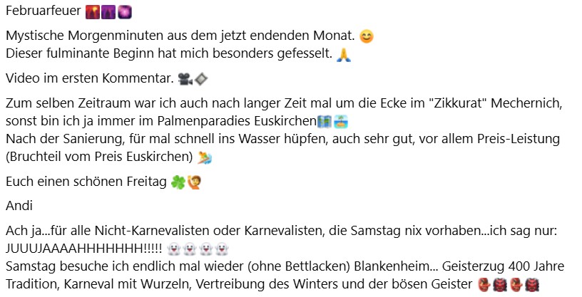 Februarfeuer Mystische Morgenminuten aus dem jetzt endenden Monat. Dieser fulminante Beginn hat mich besonders gefesselt. Video im ersten Kommentar. Zum selben Zeitraum war ich auch nach langer Zeit mal um die Ecke im "Zikkurat" Mechernich, sonst bin ich ja immer im Palmenparadies EuskirchenNach der Sanierung, für mal schnell ins Wasser hüpfen, auch sehr gut, vor allem Preis-Leistung (Bruchteil vom Preis Euskirchen) Euch einen schönen Freitag