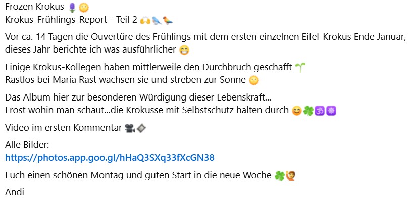 Frozen Krokus Krokus-Frühlings-Report - Teil 2 Vor ca. 14 Tagen die Ouvertüre des Frühlings mit dem ersten einzelnen Eifel-Krokus Ende Januar, dieses Jahr berichte ich was ausführlicher Einige Krokus-Kollegen haben mittlerweile den Durchbruch geschafft Rastlos bei Maria Rast wachsen sie und streben zur Sonne Das Album hier zur besonderen Würdigung dieser Lebenskraft...Frost wohin man schaut...die Krokusse mit Selbstschutz halten durch Video im ersten Kommentar