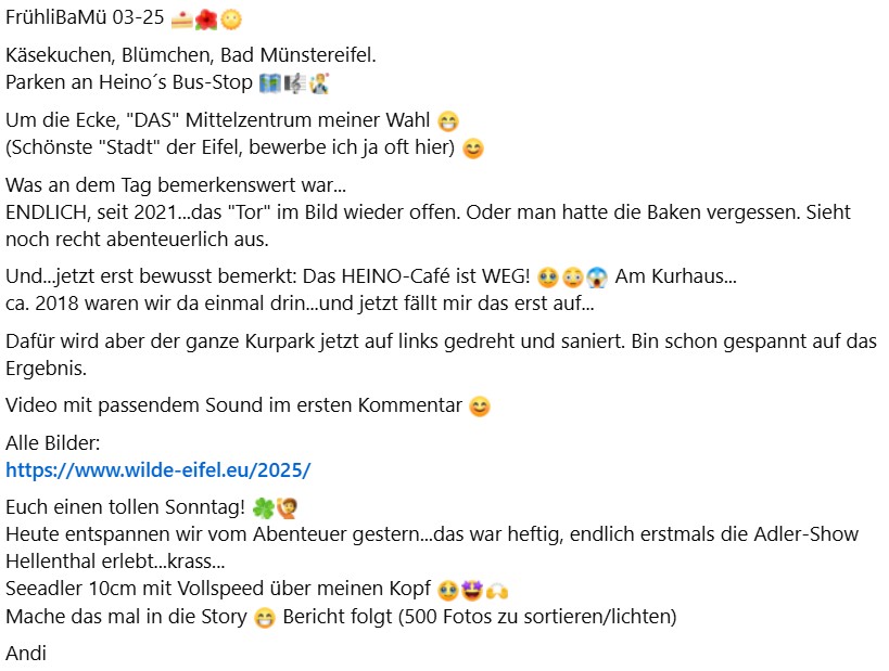FrühliBaMü 03-25 Käsekuchen, Blümchen, Bad Münstereifel.Parken an Heino´s Bus-Stop Um die Ecke, "DAS" Mittelzentrum meiner Wahl (Schönste "Stadt" der Eifel, bewerbe ich ja oft hier) Was an dem Tag bemerkenswert war...ENDLICH, seit 2021...das "Tor" im Bild wieder offen. Oder man hatte die Baken vergessen. Sieht noch recht abenteuerlich aus.Und...jetzt erst bewusst bemerkt: Das HEINO-Café ist WEG! Am Kurhaus...ca. 2018 waren wir da einmal drin...und jetzt fällt mir das erst auf...Dafür wird aber der ganze Kurpark jetzt auf links gedreht und saniert. Bin schon gespannt auf das Ergebnis.