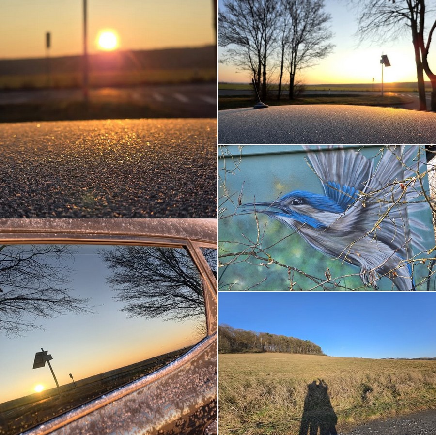 Kein Mitfahrer gefunden, dafür Sonnenaufgang deluxe, Reif auf dem Autodach wie Puderzucker auf frisch gebackener Realität.