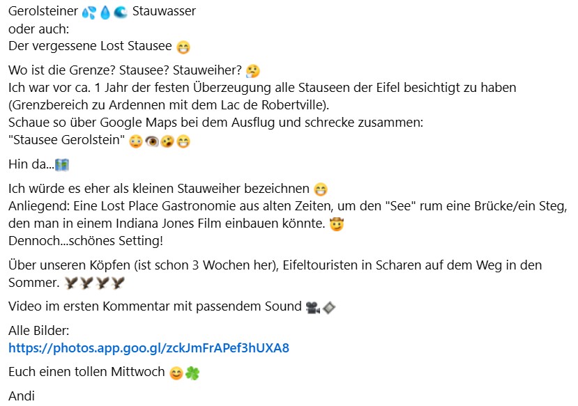 Gerolsteiner Stauwasser oder auch:Der vergessene Lost Stausee Wo ist die Grenze? Stausee? Stauweiher? Ich war vor ca. 1 Jahr der festen Überzeugung alle Stauseen der Eifel besichtigt zu haben (Grenzbereich zu Ardennen mit dem Lac de Robertville).Schaue so über Google Maps bei dem Ausflug und schrecke zusammen:"Stausee Gerolstein" Hin da...Ich würde es eher als kleinen Stauweiher bezeichnen Anliegend: Eine Lost Place Gastronomie aus alten Zeiten, um den "See" rum eine Brücke/ein Steg, den man in einem Indiana Jones Film einbauen könnte. Dennoch...schönes Setting!Über unseren Köpfen (ist schon 3 Wochen her), Eifeltouristen in Scharen auf dem Weg in den Sommer.