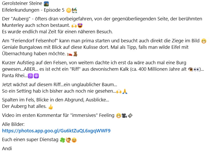 Gerolsteiner Steine Eifelerkundungen - Episode 5 Der "Auberg" - öfters dran vorbeigefahren, von der gegenüberliegenden Seite, der berühmten Munterley auch schon bestaunt. Es wurde endlich mal Zeit für einen näheren Besuch.Am "Feriendorf Felsenhof" kann man prima starten und besucht auch direkt die Ziege im Bild Geniale Bungalows mit Blick auf diese Kulisse dort. Mal als Tipp, falls man wilde Eifel mit Übernachtung haben möchte. Kurzer Aufstieg auf den Felsen, von weitem dachte ich erst da wäre auch mal eine Burg gewesen...ABER... es ist echt ein "Riff" aus devonischem Kalk (ca. 400 Millionen Jahre alt )...Panta Rhei...Jetzt wächst auf diesem Riff...ein unglaublicher Baum...So ein Setting hab ich bisher auch noch nie gesehen...Spalten im Fels, Blicke in den Abgrund, Ausblicke...Der Auberg hat alles.