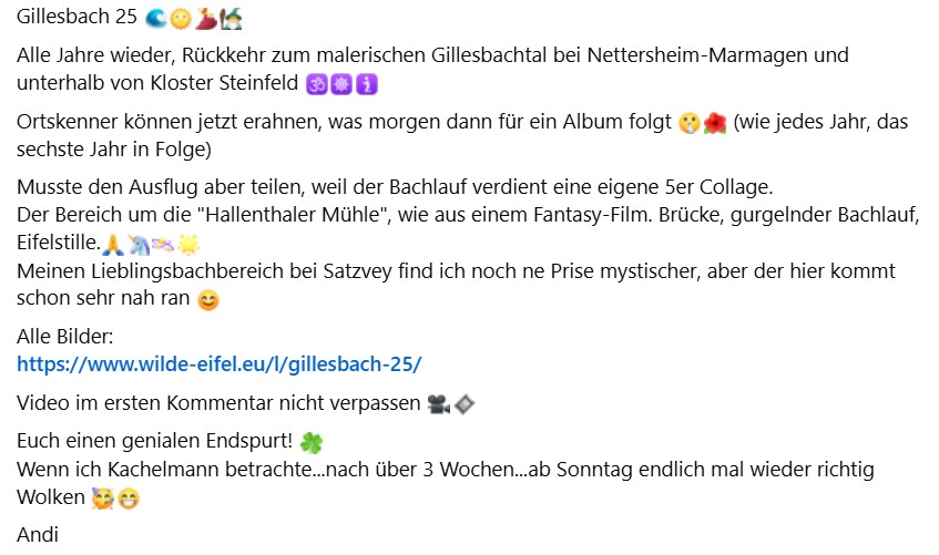 Gillesbach 25 Alle Jahre wieder, Rückkehr zum malerischen Gillesbachtal bei Nettersheim-Marmagen und unterhalb von Kloster Steinfeld Ortskenner können jetzt erahnen, was morgen dann für ein Album folgt (wie jedes Jahr, das sechste Jahr in Folge)Musste den Ausflug aber teilen, weil der Bachlauf verdient eine eigene 5er Collage.Der Bereich um die "Hallenthaler Mühle", wie aus einem Fantasy-Film. Brücke, gurgelnder Bachlauf, Eifelstille.Meinen Lieblingsbachbereich bei Satzvey find ich noch ne Prise mystischer, aber der hier kommt schon sehr nah ran