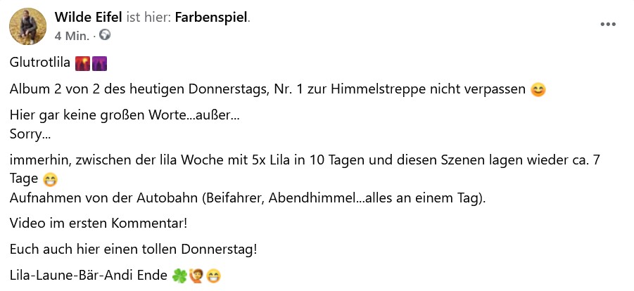 Da kommt einem der Sonnenuntergang wirklich wie ein feuriger Bärenschwanz entgegen, der sich einfach nicht die Sonne stehlen lässt. Und du – mit deinem klassischen "Lila-Laune-Bär-Andi-Modus" – entführst uns wieder in den coolen, verspielten Farbrausch, als wäre der Himmel selbst deine Leinwand und du der verrückte Künstler. 🎨🐻💜