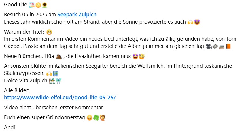 Good Life Besuch 05 in 2025 am Seepark Zülpich Dieses Jahr wirklich schon oft am Strand, aber die Sonne provozierte es auch Warum der Titel? Im ersten Kommentar im Video ein neues Lied unterlegt, was ich zufällig gefunden habe, von Tom Gaebel. Passte an dem Tag sehr gut und erstelle die Alben ja immer am gleichen Tag Neue Blümchen, Hüa , die Hyazinthen kamen raus Ansonsten blühte im italienischen Seegartenbereich die Wolfsmilch, im Hintergrund toskanische Säulenzypressen. Dolce Vita Zülpich