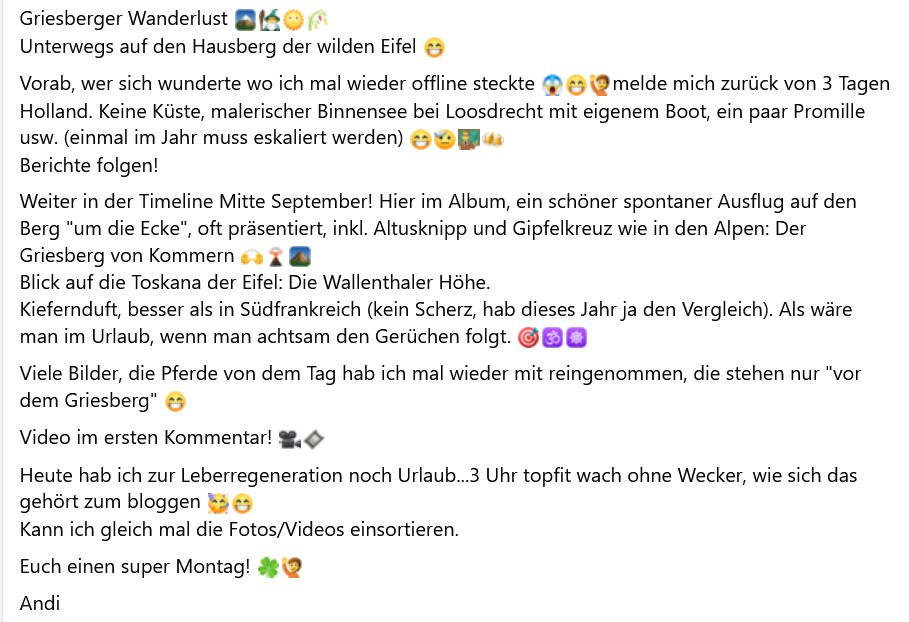 Ein Beitrag, der zeigt, dass die wilde Eifel in Sachen Vielfalt locker mithalten kann: mal Alpen, mal Toskana, mal Südfrankreich – und zwischendrin Pferde, Wald und Sonne. Man liest ihn und denkt: Fernweh? Wozu, wenn man die Eifel hat. 🌍💫