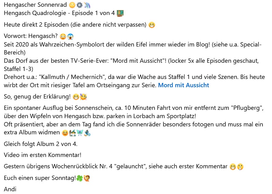 Hengascher Sonnenrad Hengasch Quadrologie - Episode 1 von 4 Heute direkt 2 Episoden (die andere nicht verpassen) Vorwort: Hengasch? Seit 2020 als Wahrzeichen-Symbolort der wilden Eifel immer wieder im Blog! (siehe u.a. Special-Bereich)Das Dorf aus der besten TV-Serie-Ever: "Mord mit Aussicht"! (locker 5x alle Episoden geschaut, Staffel 1-3)Drehort u.a.: "Kallmuth / Mechernich", da war die Wache aus Staffel 1 und viele Szenen. Bis heute wirbt der Ort mit riesiger Tafel am Ortseingang zur Serie. Mord mit AussichtSo, genug der Erklärung! Ein spontaner Ausflug bei Sonnenschein, ca. 10 Minuten Fahrt von mir entfernt zum "Pflugberg", über den Wipfeln von Hengasch bzw. parken in Lorbach am Sportplatz!Oft präsentiert, aber an dem Tag fand ich die Sonnenräder besonders fotogen und muss mal ein extra Album widmen Gleich folgt Album 2 von 4.Video im ersten Kommentar!Gestern übrigens Wochenrückblick Nr. 4 "gelauncht", siehe auch erster Kommentar Euch einen super Sonntag!Andi
