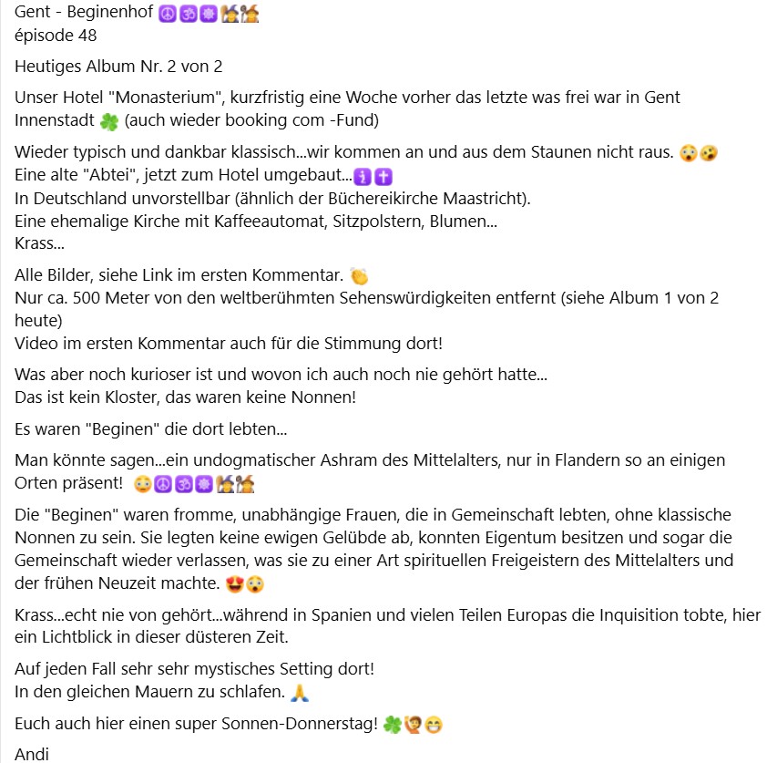 Gent - Beginenhof épisode 48 Heutiges Album Nr. 2 von 2Unser Hotel "Monasterium", kurzfristig eine Woche vorher das letzte was frei war in Gent Innenstadt (auch wieder booking com -Fund)Wieder typisch und dankbar klassisch...wir kommen an und aus dem Staunen nicht raus. Eine alte "Abtei", jetzt zum Hotel umgebaut...In Deutschland unvorstellbar (ähnlich der Büchereikirche Maastricht).Eine ehemalige Kirche mit Kaffeeautomat, Sitzpolstern, Blumen...Krass...Alle Bilder, siehe Link im ersten Kommentar. Nur ca. 500 Meter von den weltberühmten Sehenswürdigkeiten entfernt (siehe Album 1 von 2 heute)Video im ersten Kommentar auch für die Stimmung dort!Was aber noch kurioser ist und wovon ich auch noch nie gehört hatte...Das ist kein Kloster, das waren keine Nonnen! Es waren "Beginen" die dort lebten...Man könnte sagen...ein undogmatischer Ashram des Mittelalters, nur in Flandern so an einigen Orten präsent! Die "Beginen" waren fromme, unabhängige Frauen, die in Gemeinschaft lebten, ohne klassische Nonnen zu sein. Sie legten keine ewigen Gelübde ab, konnten Eigentum besitzen und sogar die Gemeinschaft wieder verlassen, was sie zu einer Art spirituellen Freigeistern des Mittelalters und der frühen Neuzeit machte. Krass...echt nie von gehört...während in Spanien und vielen Teilen Europas die Inquisition tobte, hier ein Lichtblick in dieser düsteren Zeit.Auf jeden Fall sehr sehr mystisches Setting dort! In den gleichen Mauern zu schlafen. Euch auch hier einen super Sonnen-Donnerstag! Andi