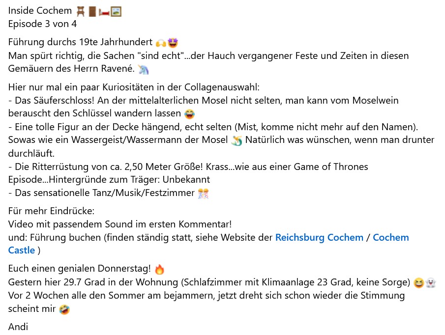 Inside Cochem Episode 3 von 4 Führung durchs 19te Jahrhundert Man spürt richtig, die Sachen "sind echt"...der Hauch vergangener Feste und Zeiten in diesen Gemäuern des Herrn Ravené. Hier nur mal ein paar Kuriositäten in der Collagenauswahl:- Das Säuferschloss! An der mittelalterlichen Mosel nicht selten, man kann vom Moselwein berauscht den Schlüssel wandern lassen - Eine tolle Figur an der Decke hängend, echt selten (Mist, komme nicht mehr auf den Namen). Sowas wie ein Wassergeist/Wassermann der Mosel Natürlich was wünschen, wenn man drunter durchläuft.- Die Ritterrüstung von ca. 2,50 Meter Größe! Krass...wie aus einer Game of Thrones Episode...Hintergründe zum Träger: Unbekannt- Das sensationelle Tanz/Musik/Festzimmer Für mehr Eindrücke:Video mit passendem Sound im ersten Kommentar! und: Führung buchen (finden ständig statt, siehe Website der Reichsburg Cochem / Cochem Castle )