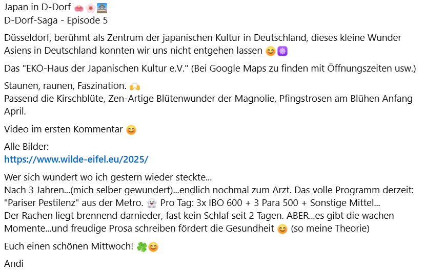 Japan in D-Dorf D-Dorf-Saga - Episode 5Düsseldorf, berühmt als Zentrum der japanischen Kultur in Deutschland, dieses kleine Wunder Asiens in Deutschland konnten wir uns nicht entgehen lassen Das "EKŌ-Haus der Japanischen Kultur e.V." (Bei Google Maps zu finden mit Öffnungszeiten usw.)Staunen, raunen, Faszination. Passend die Kirschblüte, Zen-Artige Blütenwunder der Magnolie, Pfingstrosen am Blühen Anfang April.